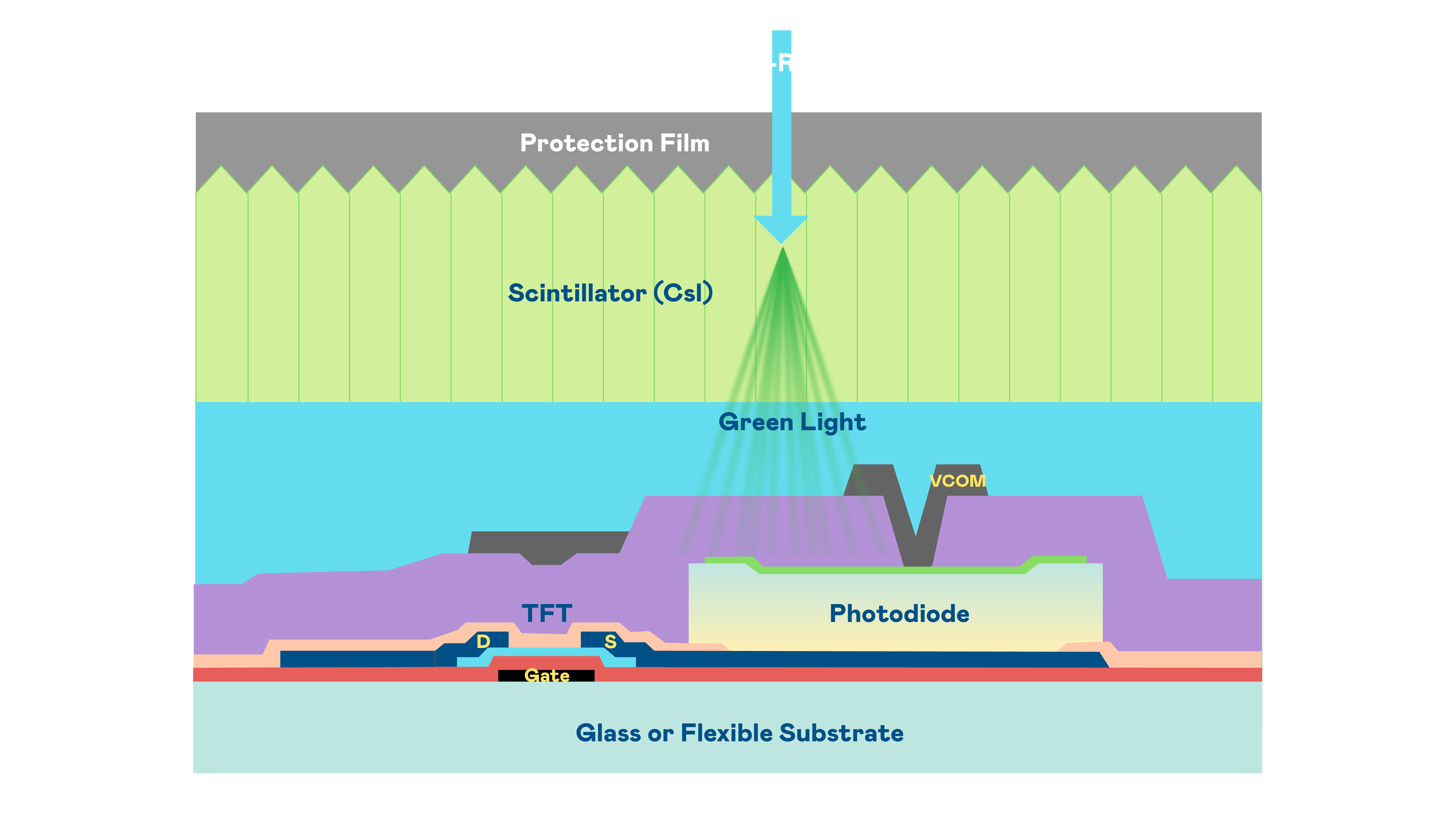 4001百老汇的X光影像感测阵列使用薄膜电晶体 (TFT) 作为每个像素的读取开关,搭配光电二极体(Photodiode)的光电转换元件,用以感测X光影像讯号。